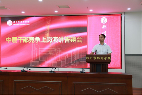 为进一步完善学校选人用人工作机制,优化学校管理部门和干部队伍结构,8月27日上午,郑州市郑开学校召开中层干部竞争上岗演讲答辩会,会议由学校校长张常立主持,全体教师参加会议。
