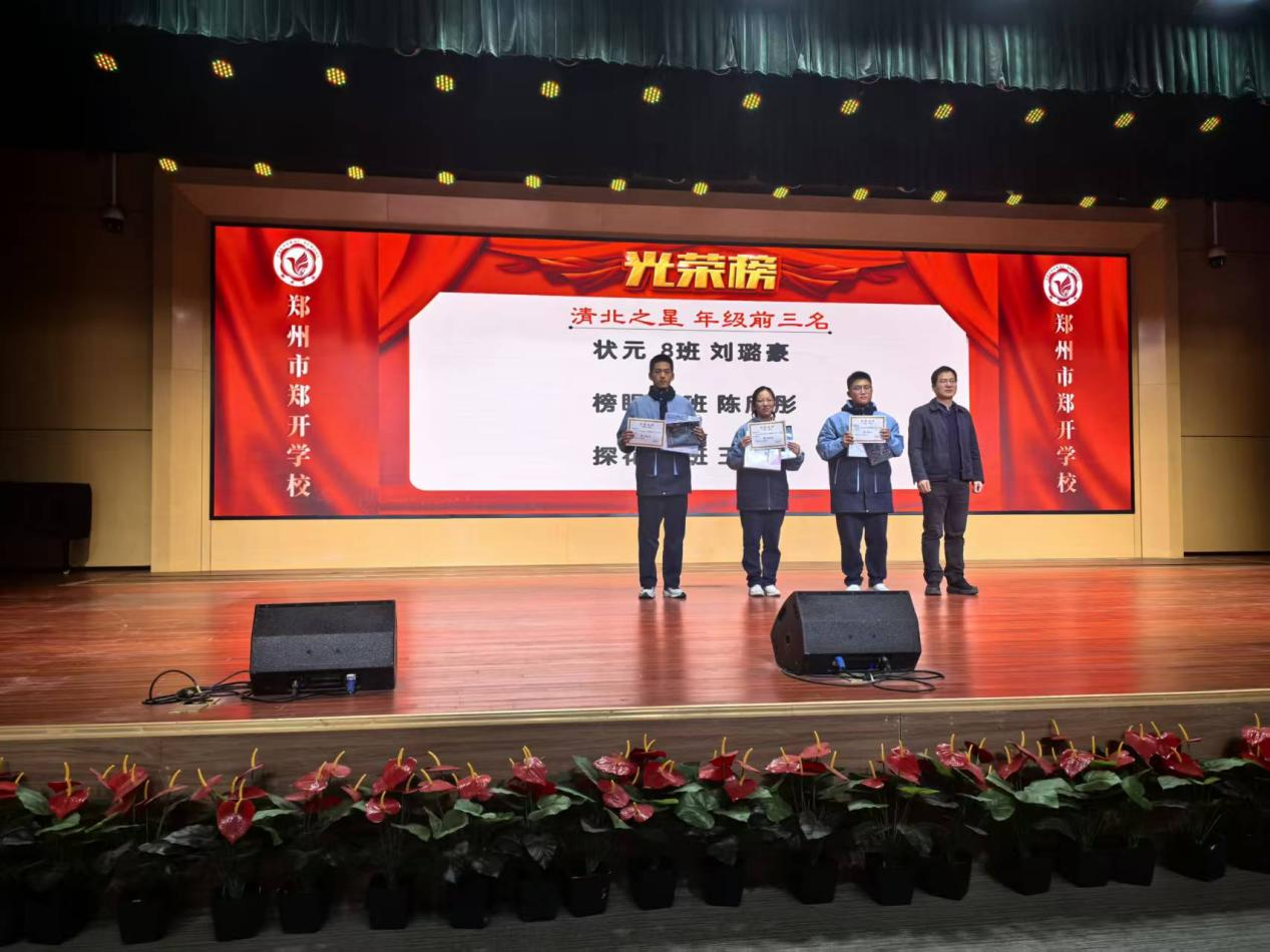 大会对在期中考试中取得优异成绩和显著进步的同学进行嘉奖。其中最引人注目的是“清北之星——年级前三名”的揭晓。来自8班的刘璐豪同学凭借扎实的功底和稳定的发挥,勇夺“状元”桂冠;来自10班的陈欣彤同学荣获“榜眼”称号;来自10班的王晶同学荣获“探花”称号。副校长王伟给他们颁奖,他们站在光荣的舞台上,手持象征荣誉的奖状,成为了全场最耀眼的星,充分展现了郑开学子笃学不倦、力争上游的精神风貌。