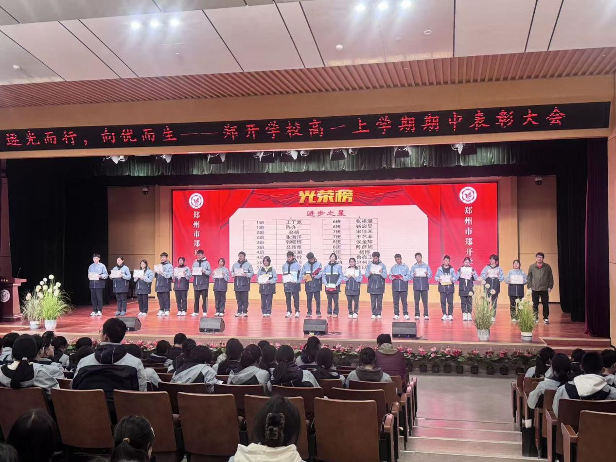 为表彰先进,树立典范,进一步激发全体学生的学习热情,近日,郑开学校高一年级举行了以“逐光而行,向优而生”为主题的上学期期中考试表彰大会。